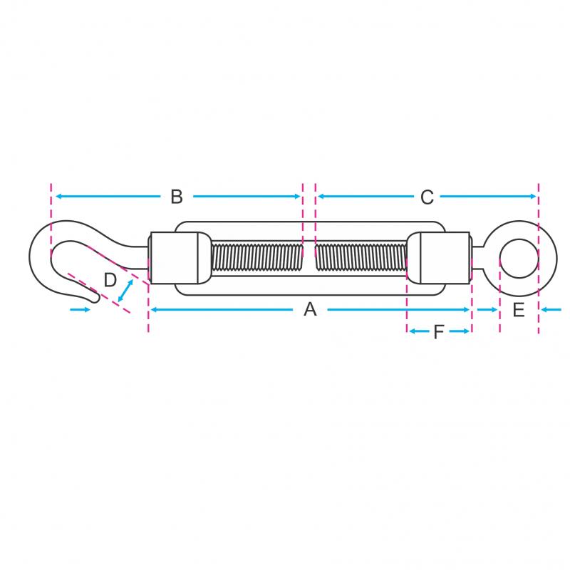 O Esticador DIN 1480 Gancho x Olhal em aço inoxidável AISI 304, é um acessório utilizado para esticar cabos de aço ou cordoalhas, e retirar as folgas em trabalhos com estaios.